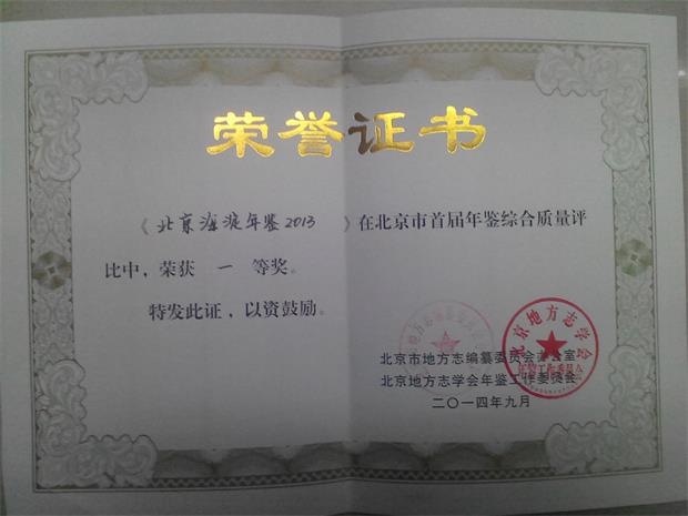 《北京海淀年鉴2013》在北京市首届年鉴综合质量评比中荣获一等奖